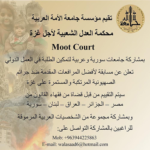 أعلنت مؤسسة جامعة الأمة العربية الثقافية عن مسابقة لأفضل مرافعة مقدمة عن الجرائم الصهيونية المرتكبة، والمستمرة على غزة ضمن محكمة العدل الشعبية لأجل غزة ”Moot court” بمشاركة جامعات سورية، وعربية، وذلك يوم السبت الموافق 29/6/2024 في قاعة التشريفات – فندق إيبلا – طريق المطار.